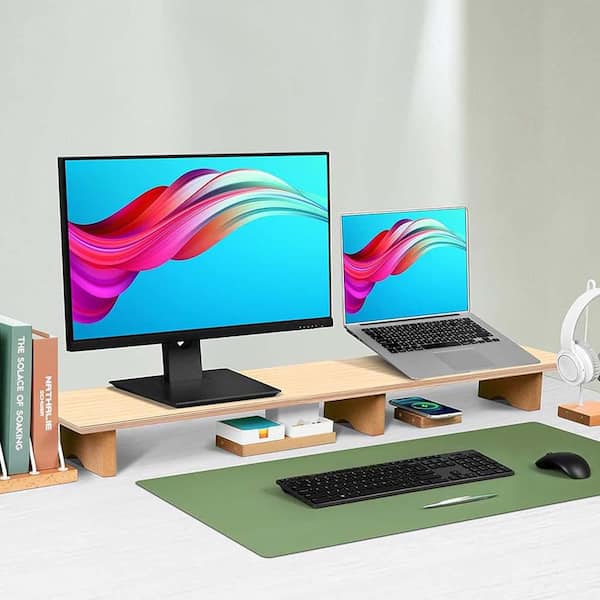 Dual Monitor Stand Riser Solid Wood Desk Shelf with Eco Cork Legs for Laptop Computer TV PC Printers Desktop Organizer