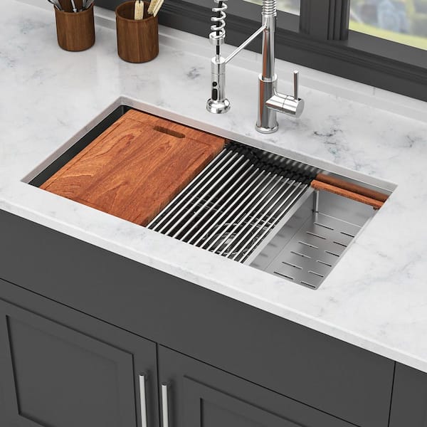 33 in. Undermount Single Bowl 16 Gauge Brushed Nickel Stainless Steel Kitchen Sink with Workstation