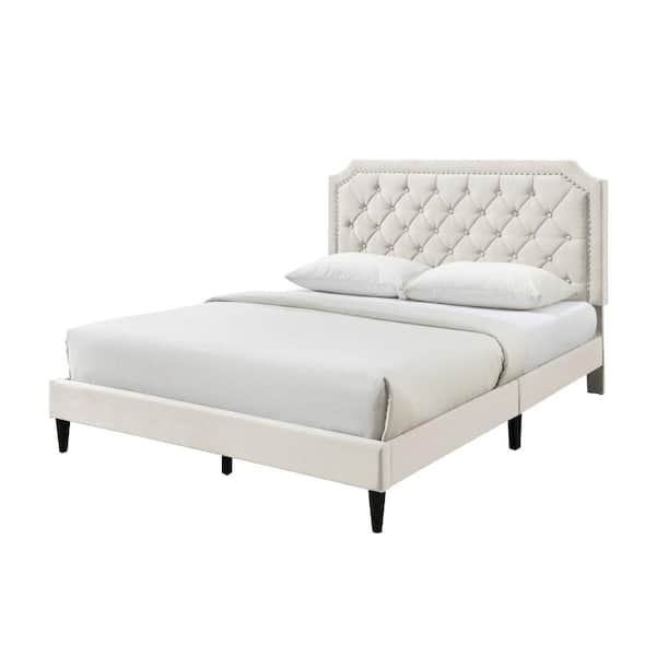 Ava Beige Velvet Upholstered Frame, Queen Platform Bed with Clipped-Edges, Button Tufts and Nailhead Trim