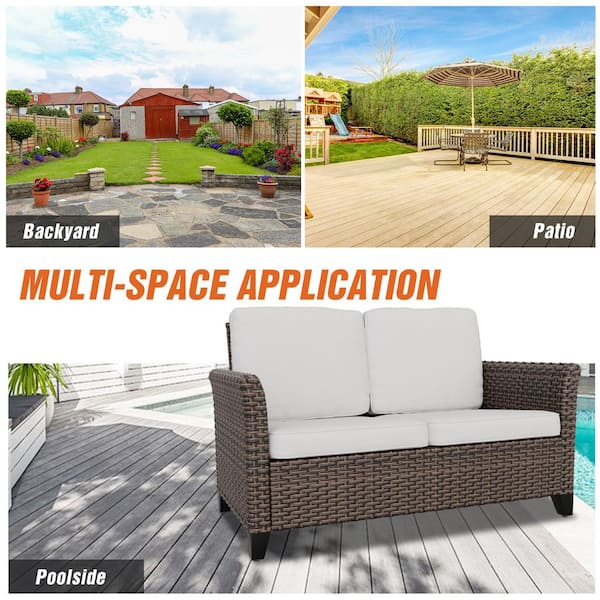 2-Color Brown Wicker Outdoor Patio Loveseat Sofa with Beige Cushions, Wide Armrest