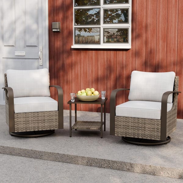 3-Piece Wicker Outdoor Rocking Chair Patio Conversation Set Swivel Chairs with Beige Cushions and Side Table
