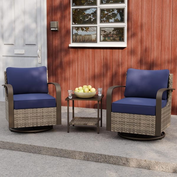 3-Piece Wicker Outdoor Rocking Chair Patio Conversation Set Swivel Chairs with Blue Cushions and Side Table
