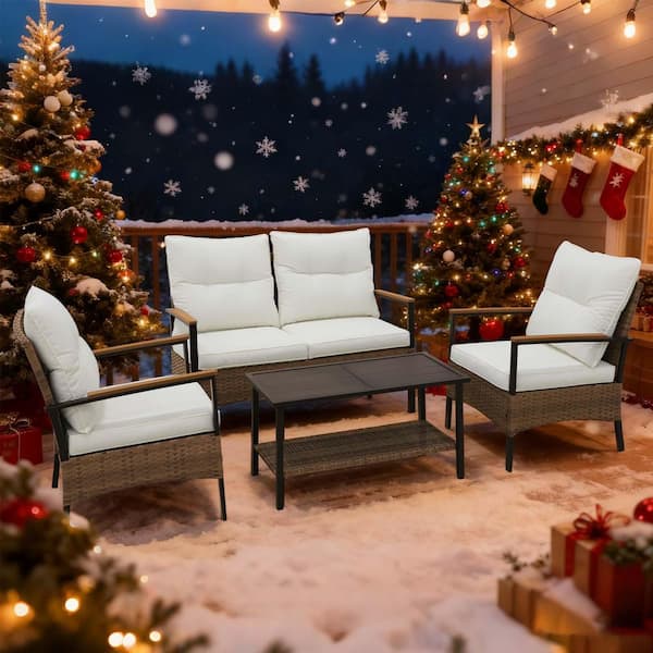 4-Piece Wicker Patio Conversation Set with Beige Cushions