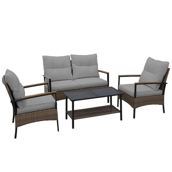 4-Piece Wicker Patio Conversation Set with Gray Cushions