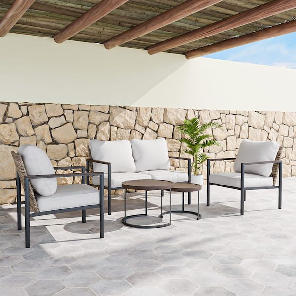 5-Piece Black Metal Frame Brown Rattan Wicker Outdoor Set Conversation Set with beige Cushions and Nesting Coffee Tabels