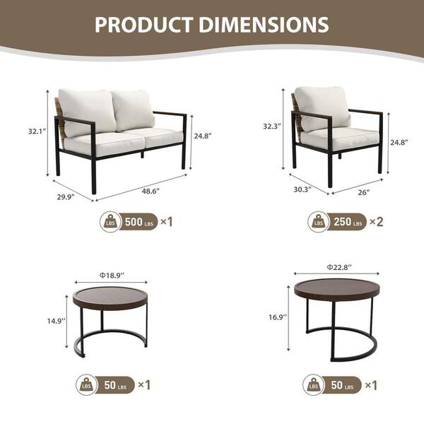 • A loveseat sofa, 2-patio chairs, 2-nesting coffee tables.