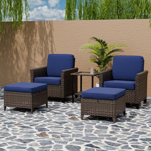 5-Piece Mix Brown Wicker Patio Conversation Set Wide Armrest Chair Set with Blue Cushions, Ottomans, Side Table