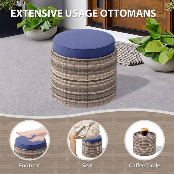 6-Piece Brown Wicker Outdoor Patio Conversation Set with Blue Cushions, with Nesting Coffee Tabels and Ottoman