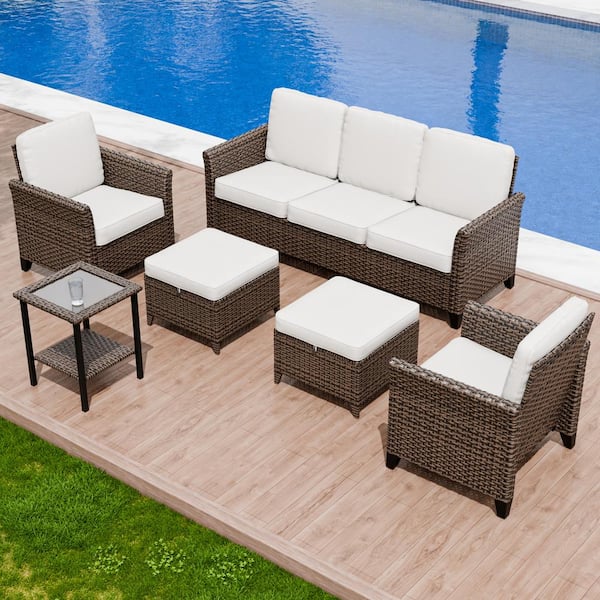 6-Piece Mix Brown Wicker Patio Conversation Set Wide Armrest 3-Seat Sofa Seating Set with Beige Cushions