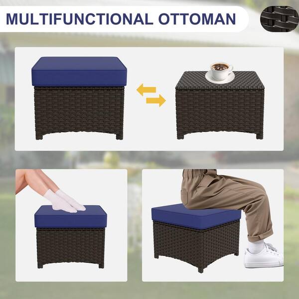 Brown Rattan Wicker 8-Piece Outdoor Patio Conversation Set with Rocking Chairs, Table, and Blue Cushions