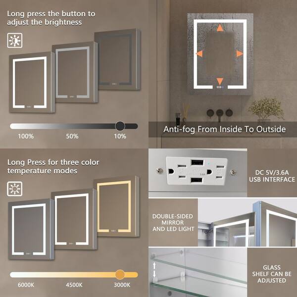 24 in. W x 30 in. H Rectangular Silver Aluminum Recessed/Surface Mount Right Hinge Dimmable Medicine Cabinet with Mirror