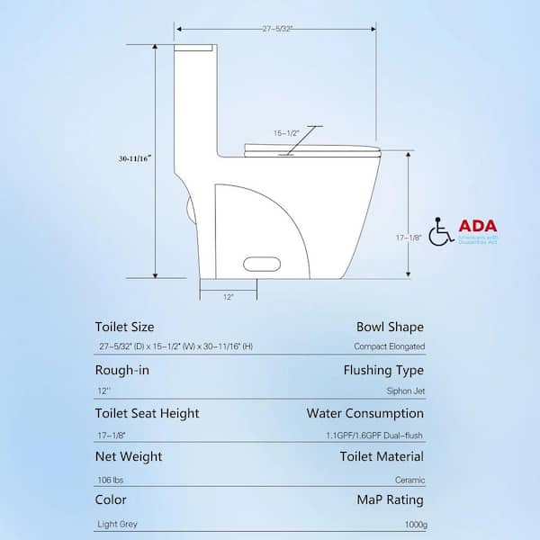 Power Flush 1-Piece 1.1/1.6 GPF Dual Flush Elongated 15.6 in" Toilet in Light Gray, Slow-Close Seat Included