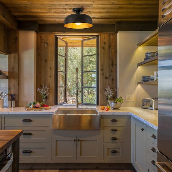 Nathan 12.2 in. 1-Light Black Farmhouse Semi Flush Mount Ceiling Light with Hammer Finish