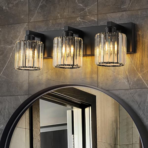Orillia 19.7 in. 3-Light Black Bathroom Vanity Light with Crystal Round Shades