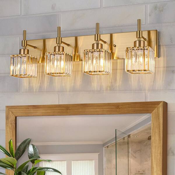 Orillia 26.4 in. 4-Light Gold Crystal Bathroom Vanity Light with Shades for Bathroom Powder Room Kitchen