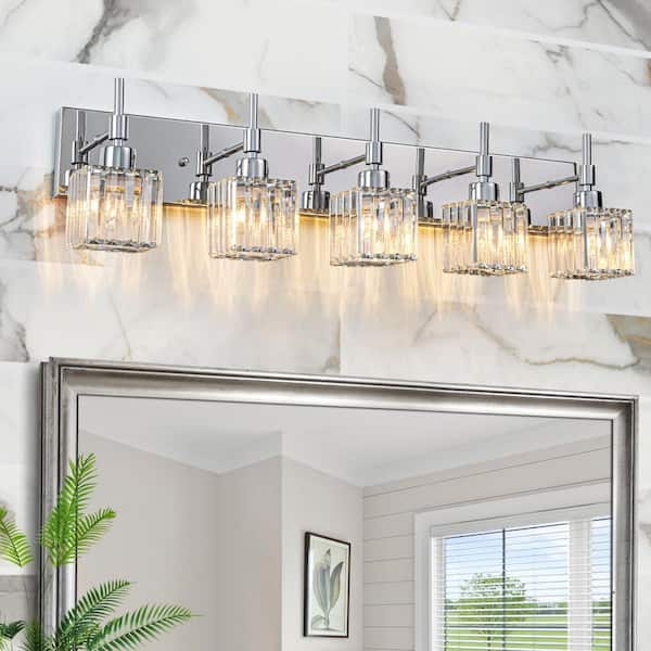 Orillia 33.1 in. 5-Light Chrome Crystal Bathroom Vanity Light with Shades for Bathroom Powder Room Kitchen