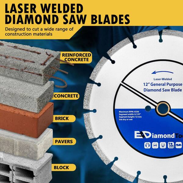 12 in. Concrete, Reinforced Concrete, Brick/Block, Segmented Rim, Laser Welded Diamond Saw Blades, 1 in. Arbor