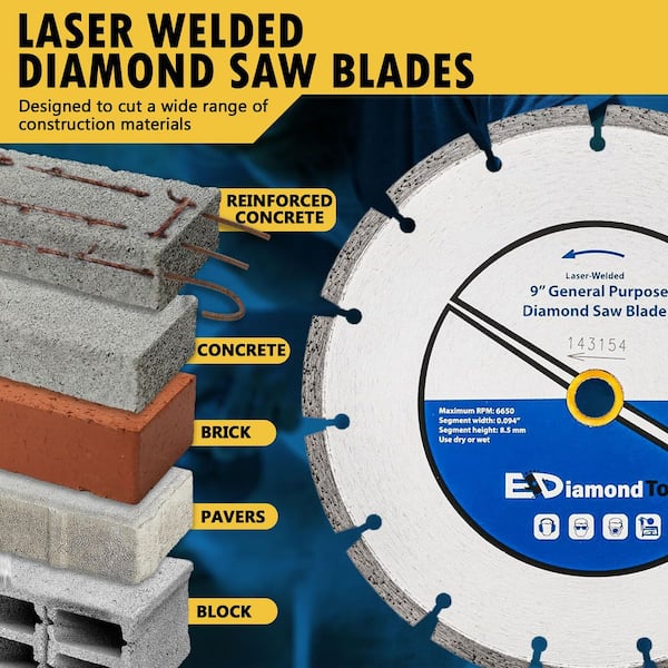 9 in. Laser Welded Diamond Saw Blade for Concrete Brick Block & Masonry, Heat Treated Blade Core, 7/8 in. -5/8 in. Arbor
