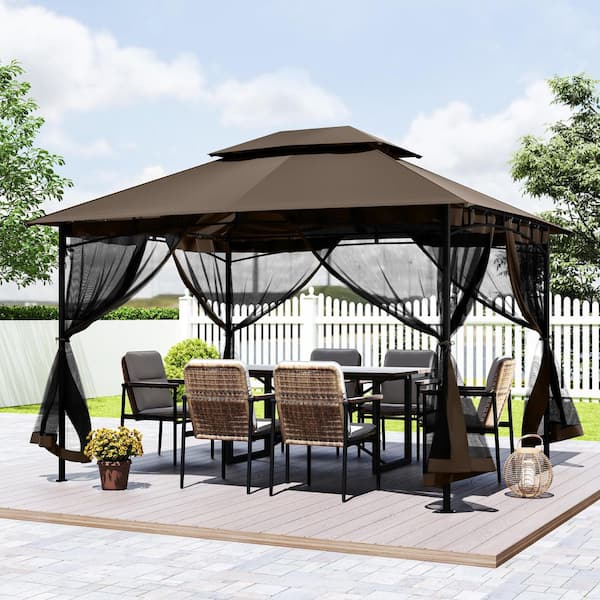10 ft. x 12 ft. Brown Double Roof Soft Top Metal Patio Gazebo with Netting