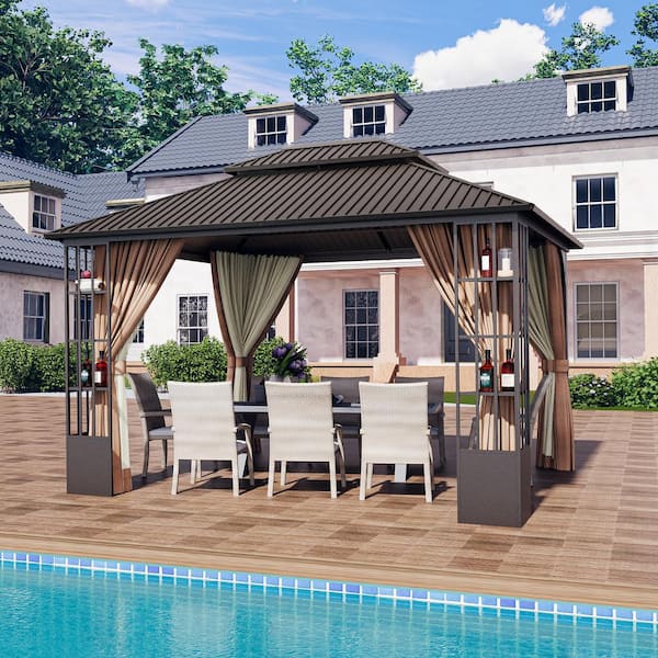 10 ft. x 12 ft. Double Roof Hardtop Patio Gazebo with Aluminum Frame, Storage Shelf and Brown Curtains
