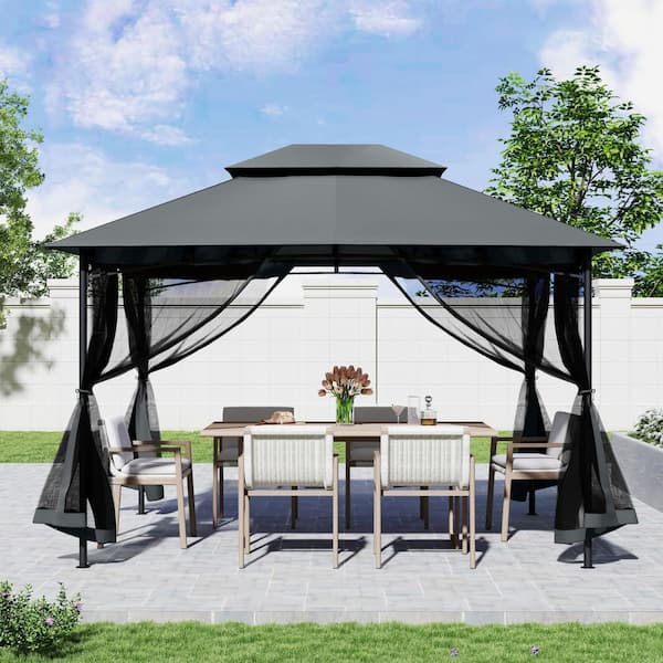 10 ft. x 12 ft. Gray Double Roof Soft Top Metal Outdoor Gazebo with Netting