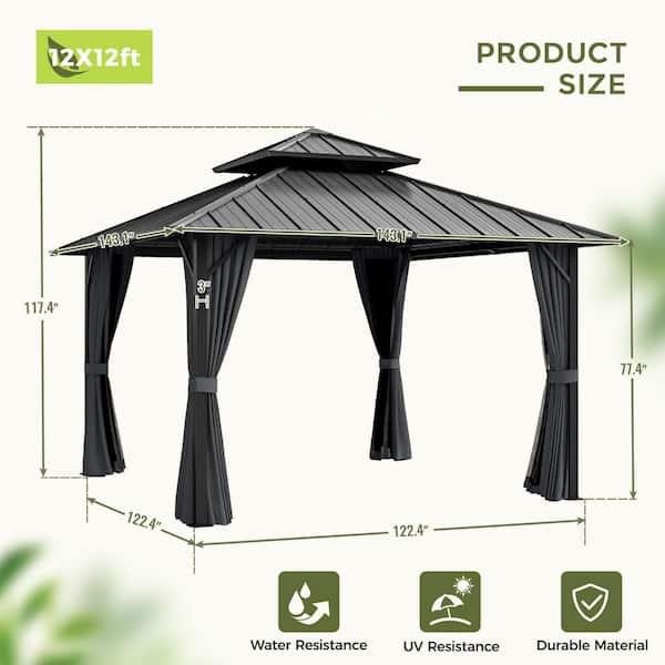 12 ft. x 12 ft. Gray Double Roof Hardtop Patio Gazebo with Netting and Gray Curtains