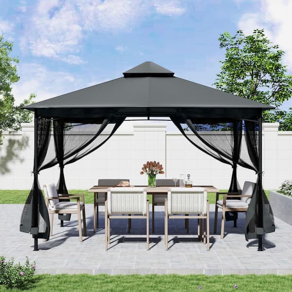12 ft. x 12 ft. Gray Double Roof Soft Top Metal Outdoor Gazebo with Netting