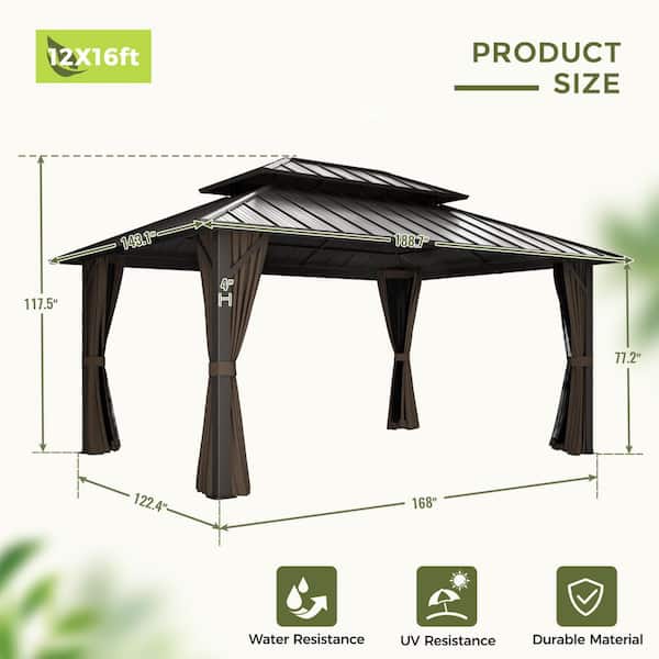 12 ft. x 16 ft. Brown Double Roof Hardtop Patio Gazebo with Netting and Curtains