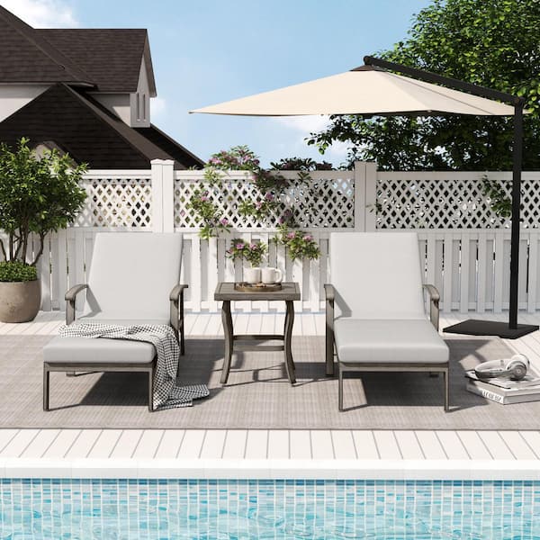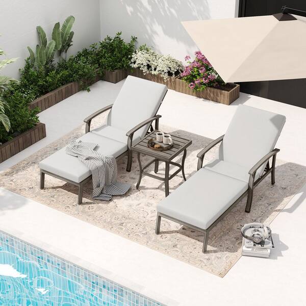 3-Piece Aluminum Outdoor Patio Chaise Lounge Set with Light Gray Cushions and Side Table