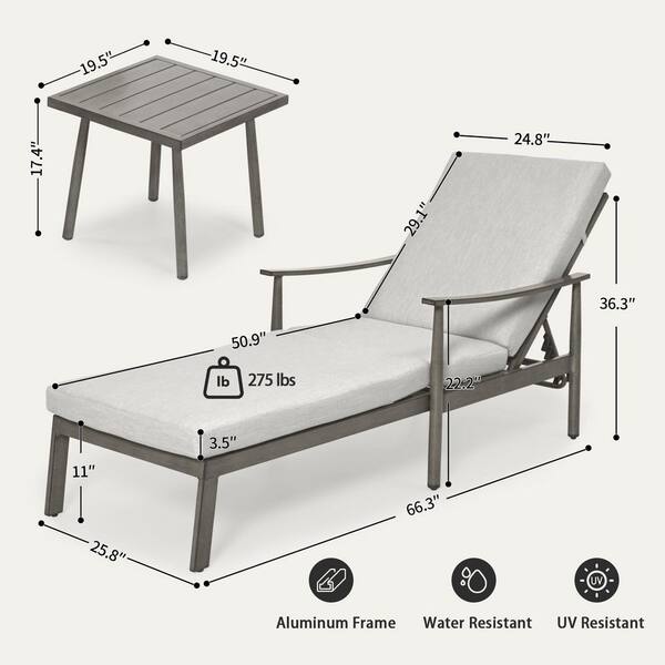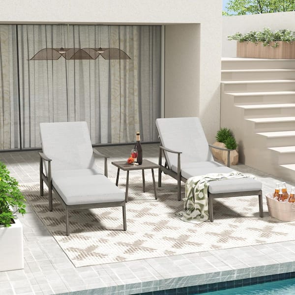 3-Piece Aluminum Outdoor Patio Chaise Lounge with Side Table and Gray Cushions