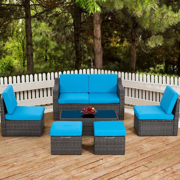 6-Piece Rattan Patio Sectional Sofa with Grey/Blue Cushions