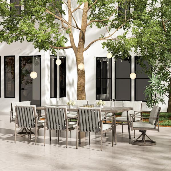 Sleek Line 9-Piece Aluminum Rectangular Outdoor Dining Set with Swivel Chairs and Light Gray Cushions