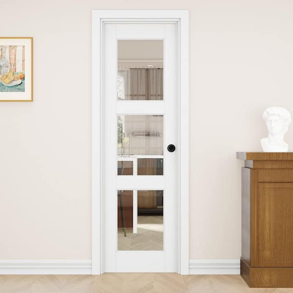 24 in. x 80 in. 3-Lite Clear Glass Left Hand White Solid Core Glass Single Prehung Interior Door+ Quick Assemble Jamb