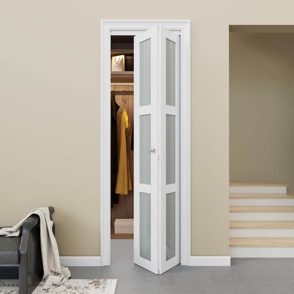 24 in. x 80 in. 3-Lite Tempered Frosted Glass and Solid Core White Finished MDF Closet Bi-Fold Door with Hardware