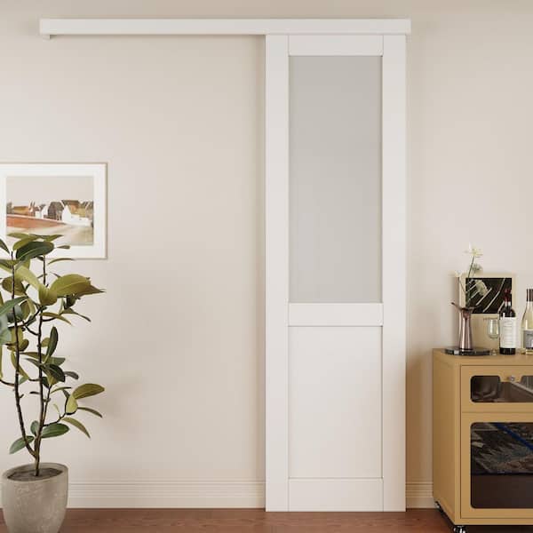 28 in. x 96 in. Hidden Track Style 1/2 Lite Frosted Glass White Primed MDF Sliding Barn Door with Hardware Kit