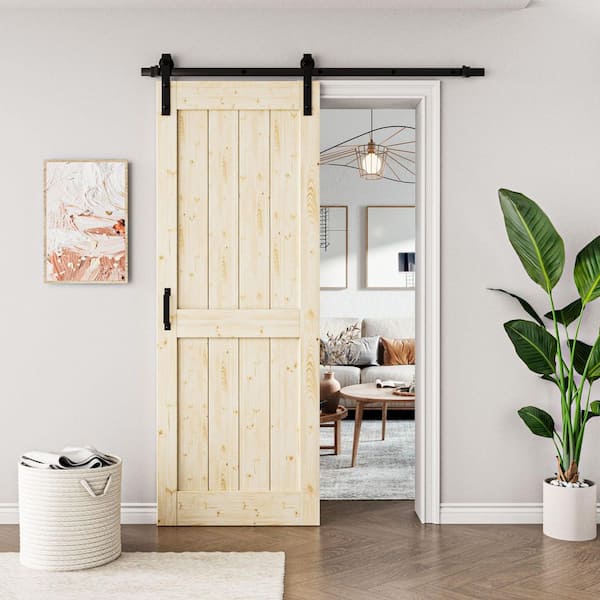 30 in. x 84 in. Paneled H Shape Solid Core Unfinished Pine Wood Sliding Barn Door Slab with Hardware Kit