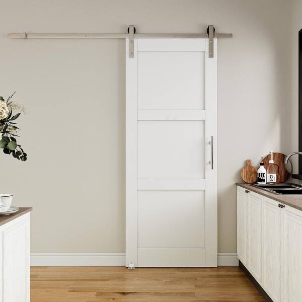 32 in. x 80 in. White Primed 3 Lite Pattern Paneled MDF Sliding Barn Door with Hardware Kit Nickel Plated