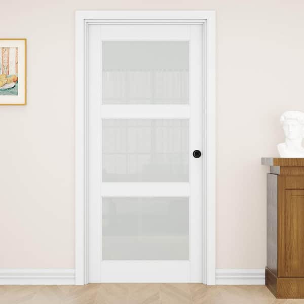 36 in. x 80 in. 3-Lite Frosted Glass Left Hand White Solid Core Glass Single Prehung Interior Door+ Quick Assemble Jamb