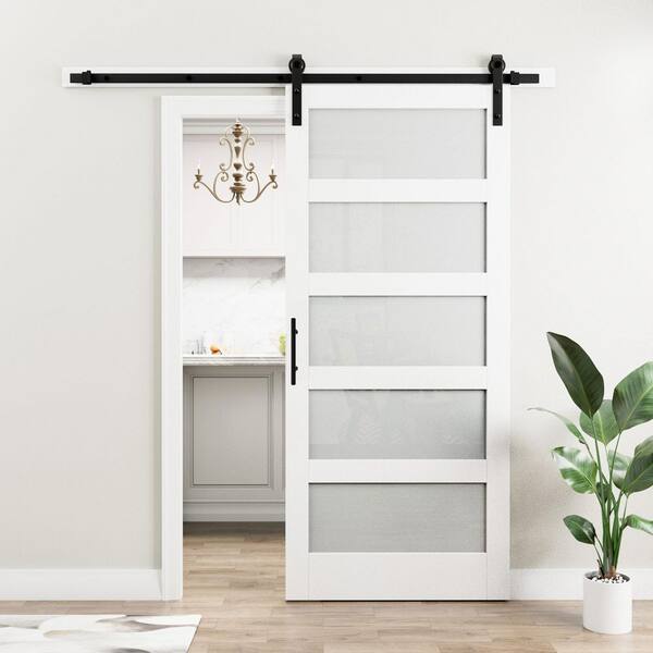 36 in. x 84 in. 5-Lite Tempered Frosted Glass White Primed MDF Sliding Barn Door Slab with Hardware and Soft Close