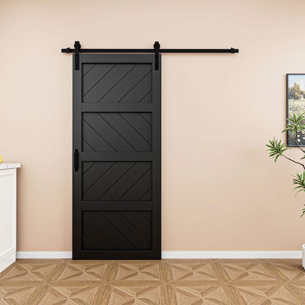 36 in. x 84 in. Black Finished 4-Lite Wave Pattern Style MDF Sliding Barn Door with Hardware Kit