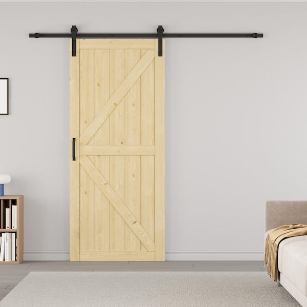 36 in. x 84 in. Paneled K Shape Solid Pine Wood Unfished Barn Door Slab with Installation Hardware Kit and Soft Close