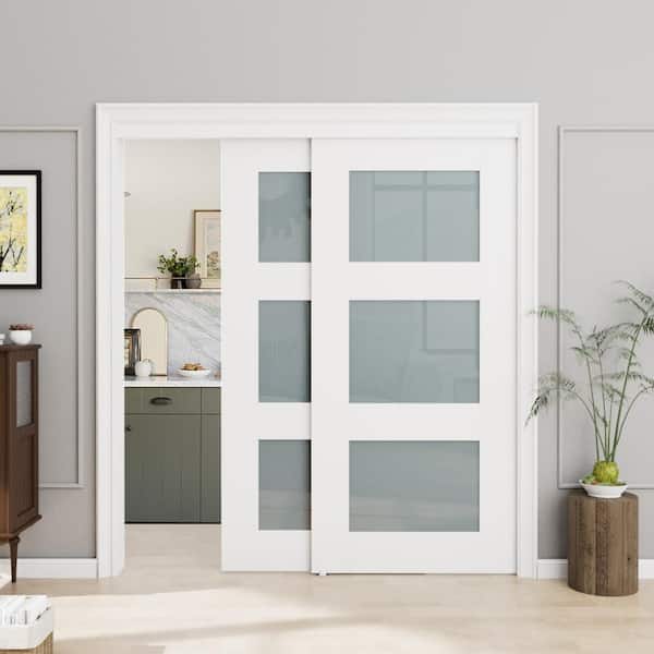 48 in. x 96 in. 3-Lites Frosted Glass Finished White MDF Closet Sliding Door with Hardware Kit