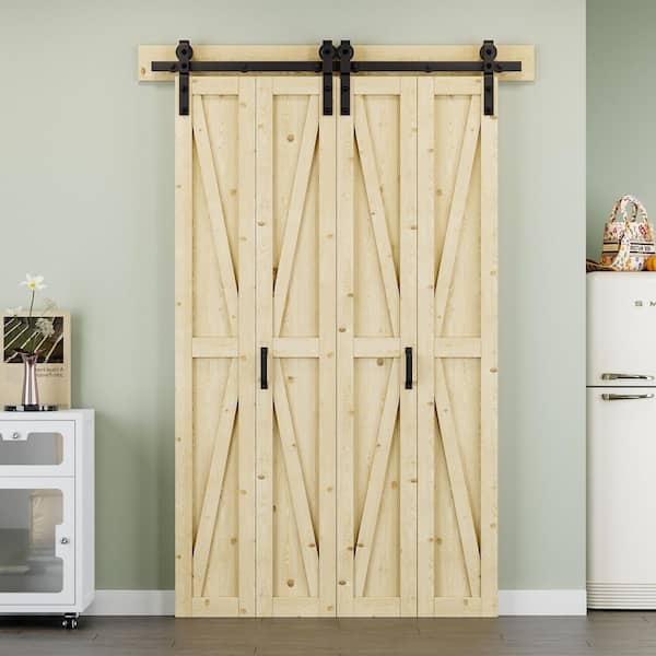 50 in. x 84 in. Paneled K Shape Solid Pine Wood Unfished Bi-fold Sliding Barn Door with Hardware Kit and Headerboard