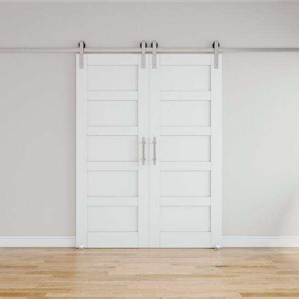 56 in. x 80 in. White Primed 5-Lite Pattern Paneled MDF Sliding Barn Door with Hardware Kit Nickel Plated