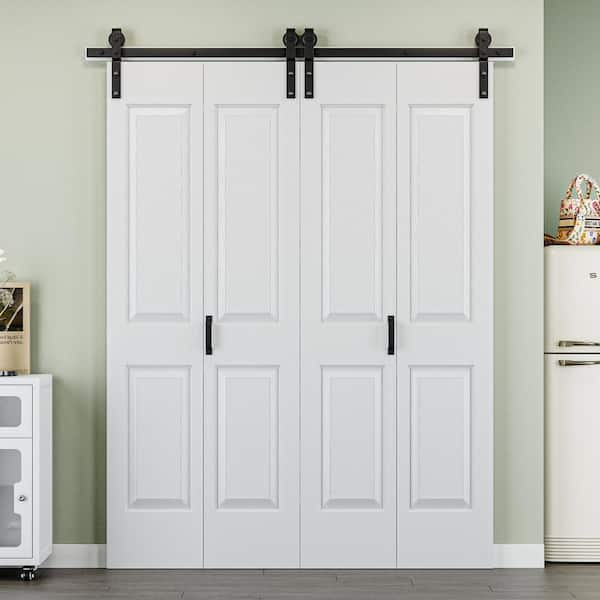 64 in. x 84 in. Easy Install 4-Panel White Primed MDF Composite Bi-Fold Sliding Barn Door with Hardware Kit and Handle