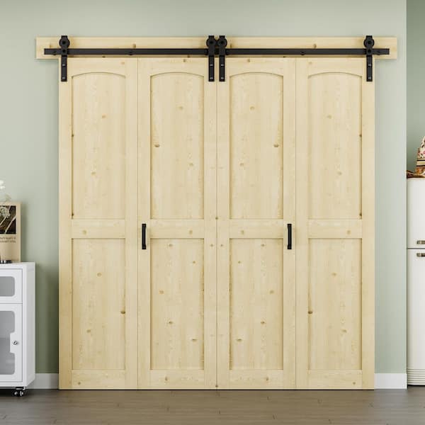80 in. x 84 in. Paneled H Shape Solid Pine Wood Unfished Bi-fold Sliding Barn Door with Hardware Kit and Headerboard