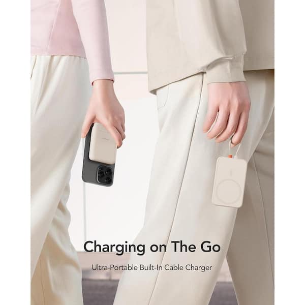 Slim Portable Charger, 5000mAh Fast Charging Power Bank with Built-In Cable for iPhone and Digital Display, Dirty White