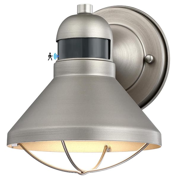 Upgraded 7.08 in. Silver Motion Sensing Dusk to Dawn Indoor/Outdoor Hardwired Barn Sconce with LED Included
