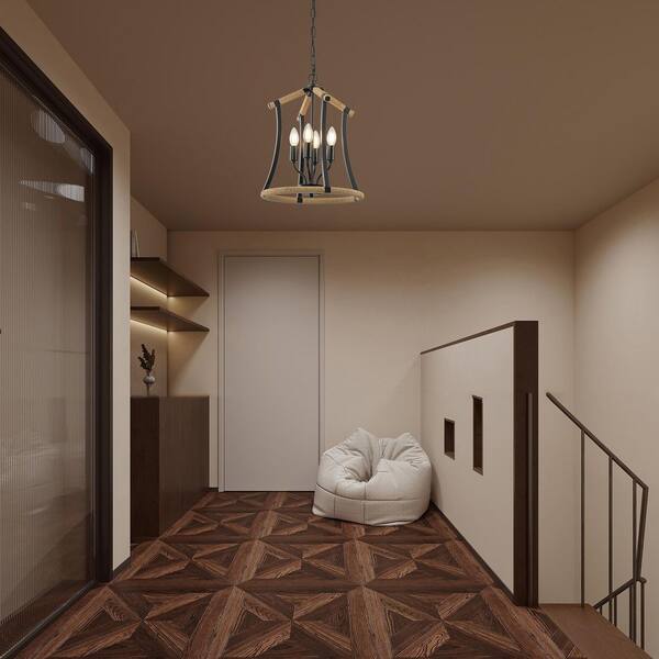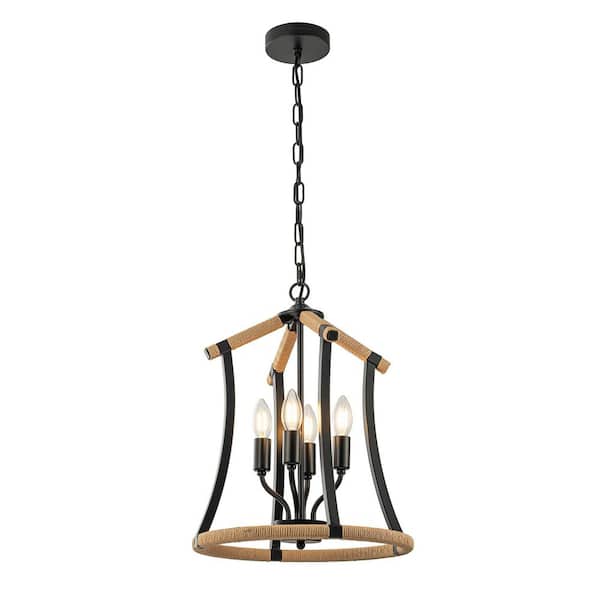 Margo 4-Light Matte Black Modern Farmhouse Lanter Chandelier Woven Rope Accent with No Bulbs Included