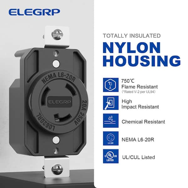 20 Amp 250-Volt NEMA L6-20R Locking Receptacle Single Outlet Industrial Grade Grounding Twist Lock, Black